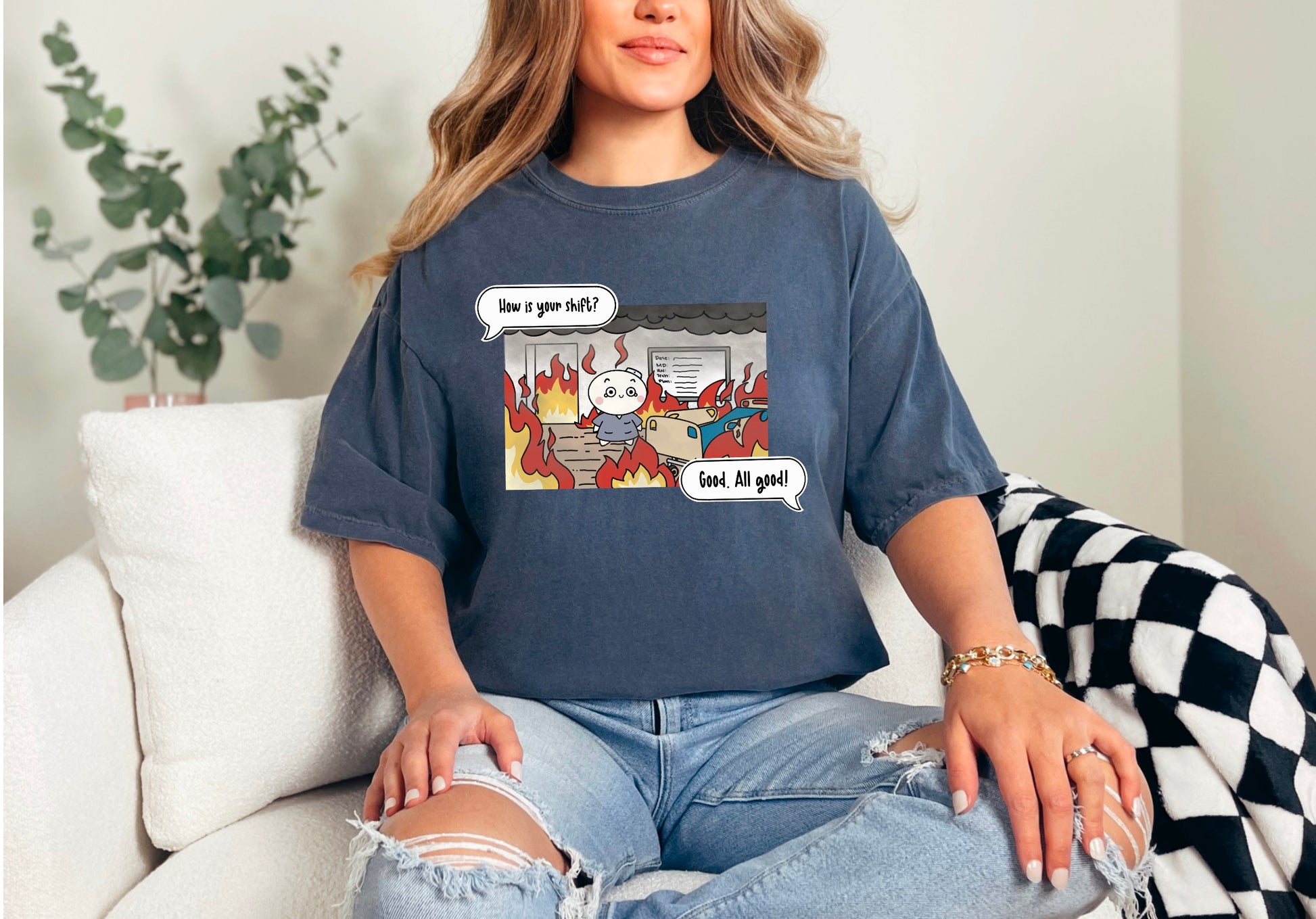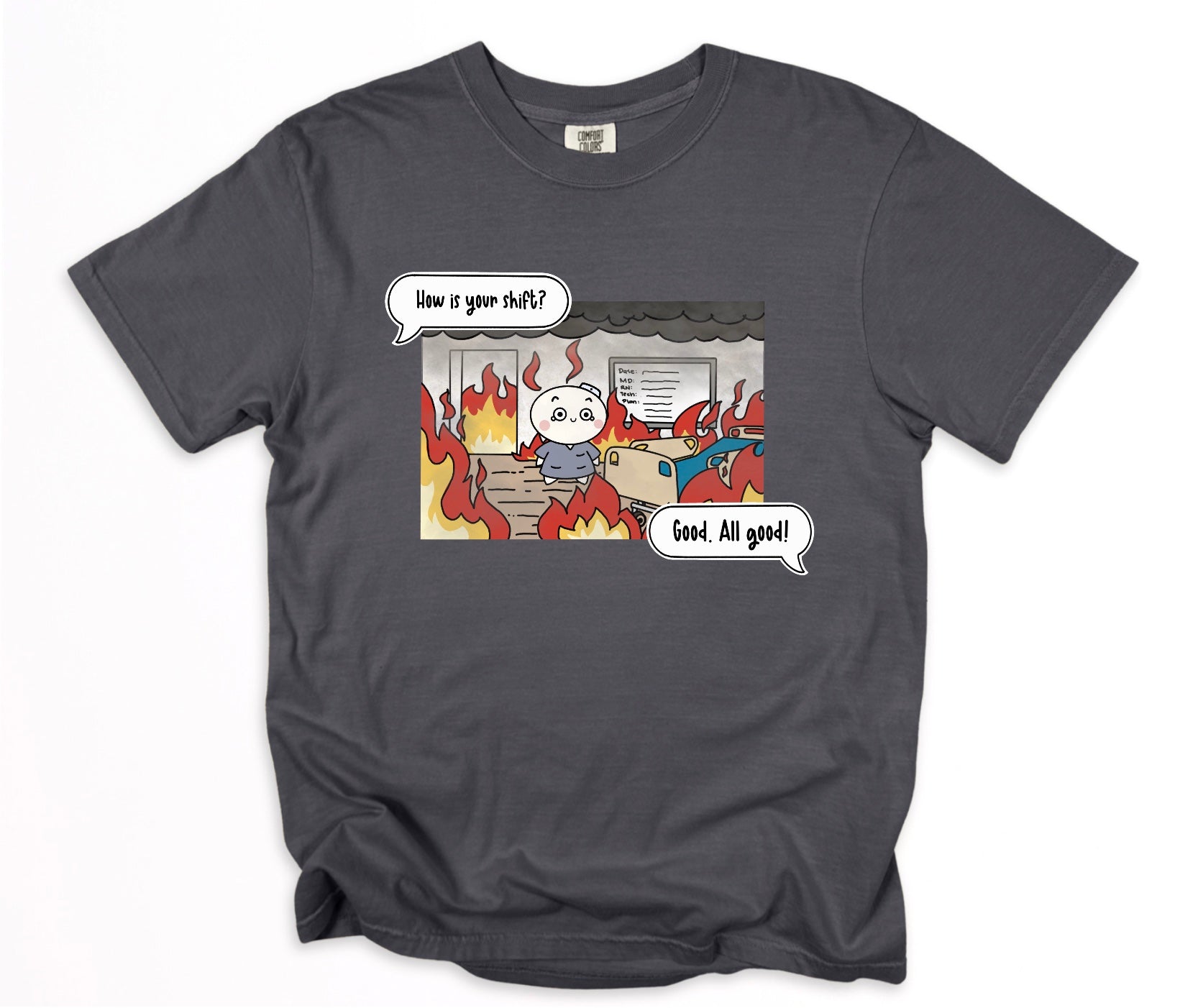 Chaos, fire, and never-ending alarms — just another day on the floor. This bold graphic tee features a nurse calmly smiling while the hospital burns around her — patients screaming, phones ringing, code blues echoing down the halls, everything is burning down… and yet, she’s unfazed.