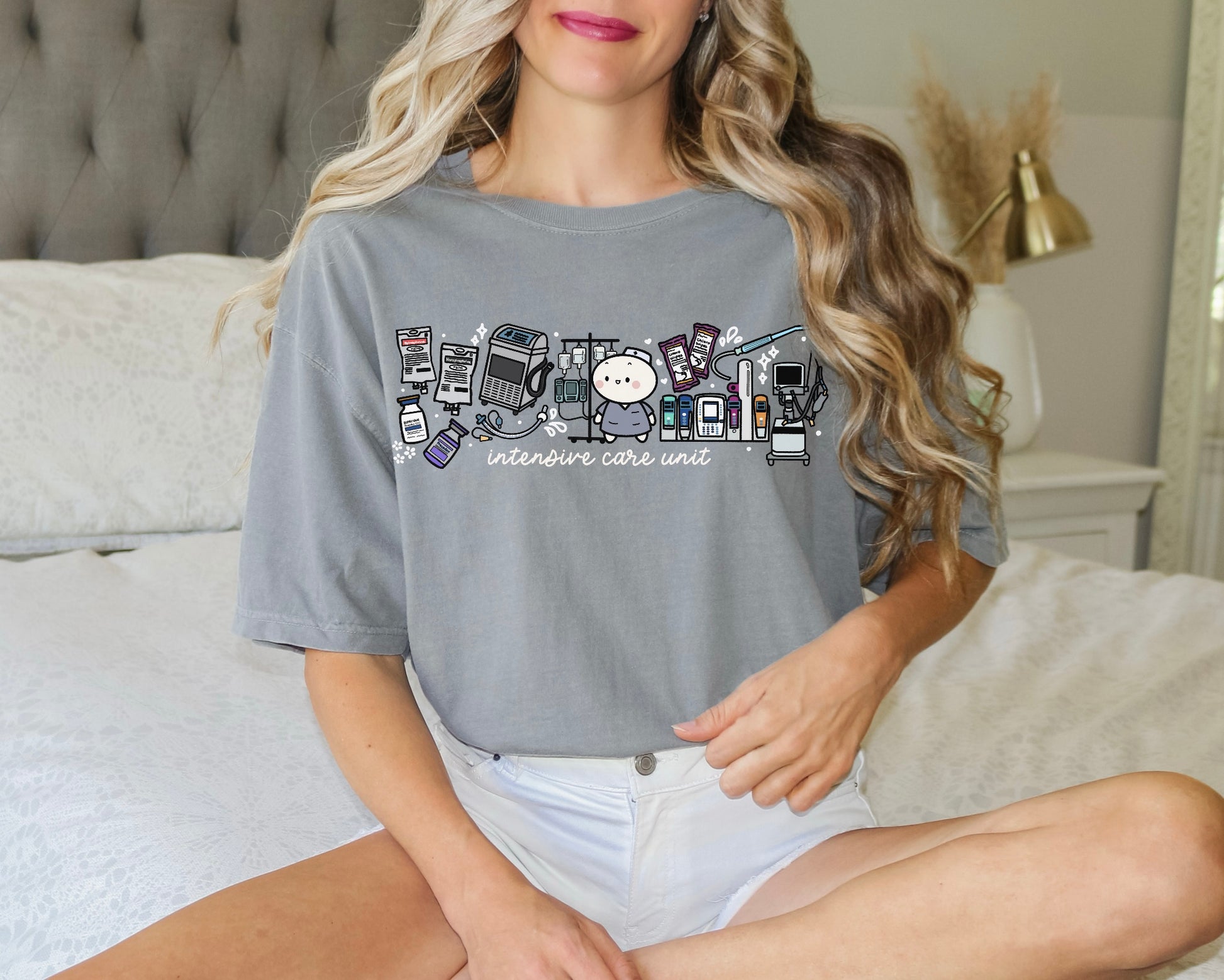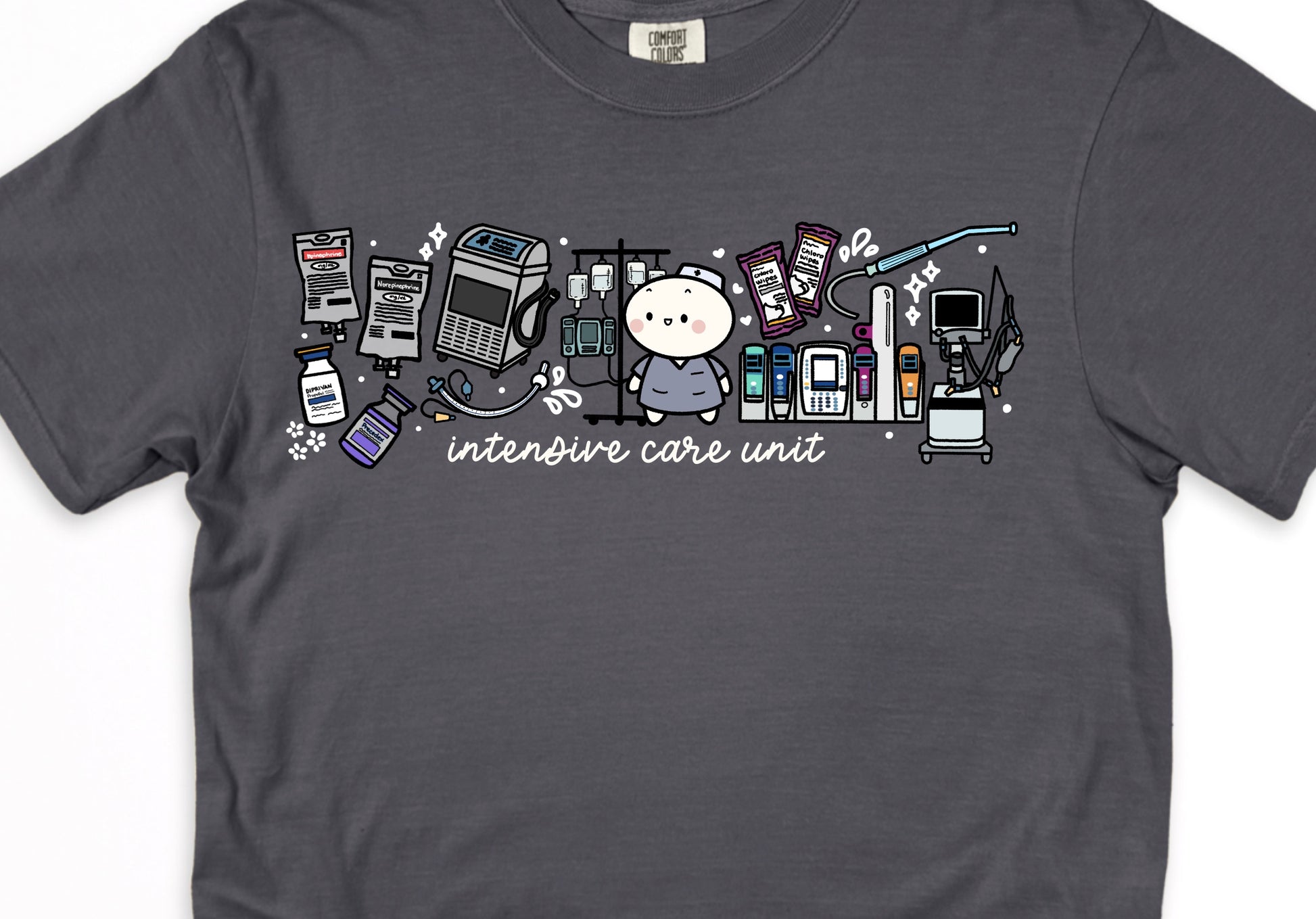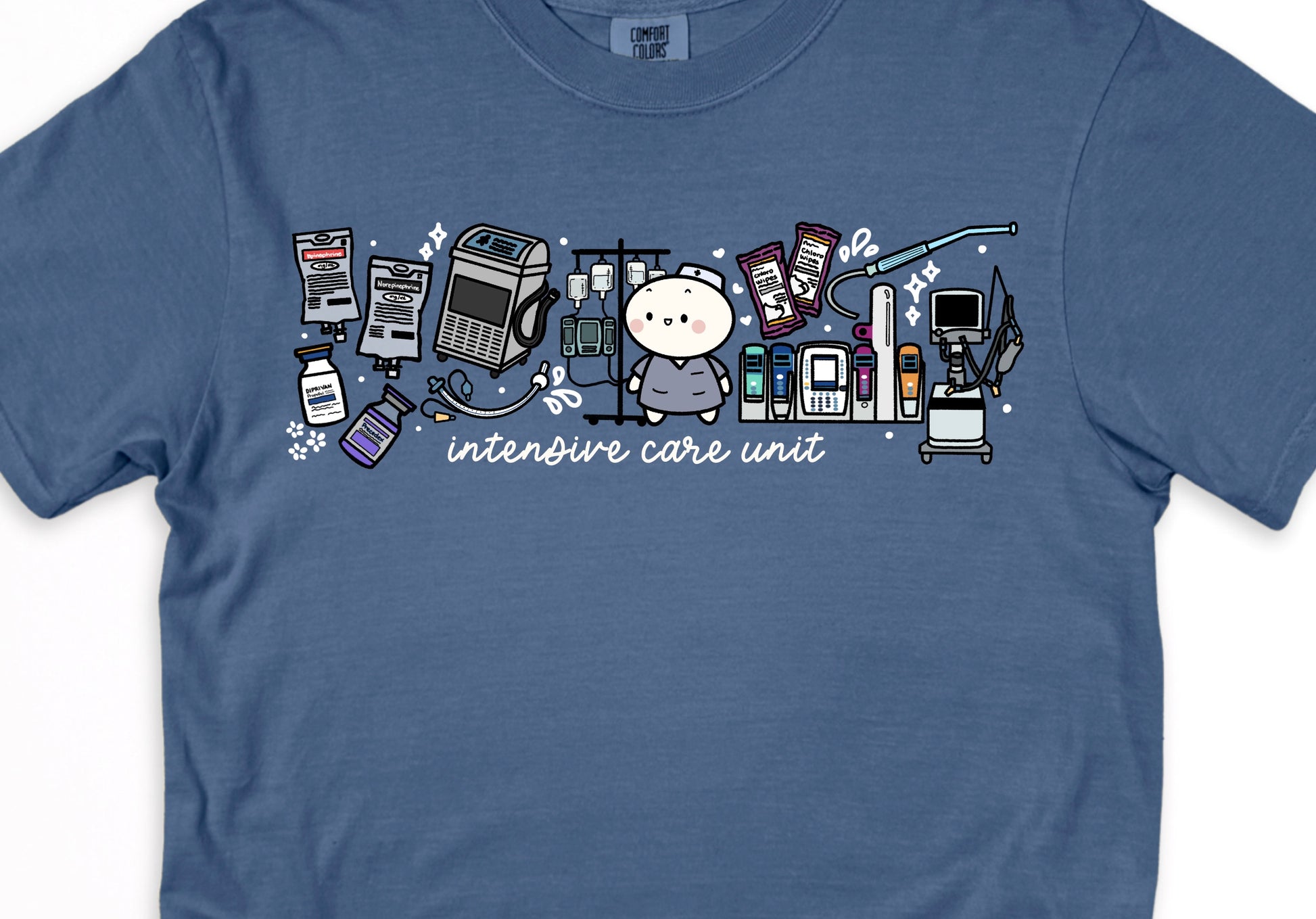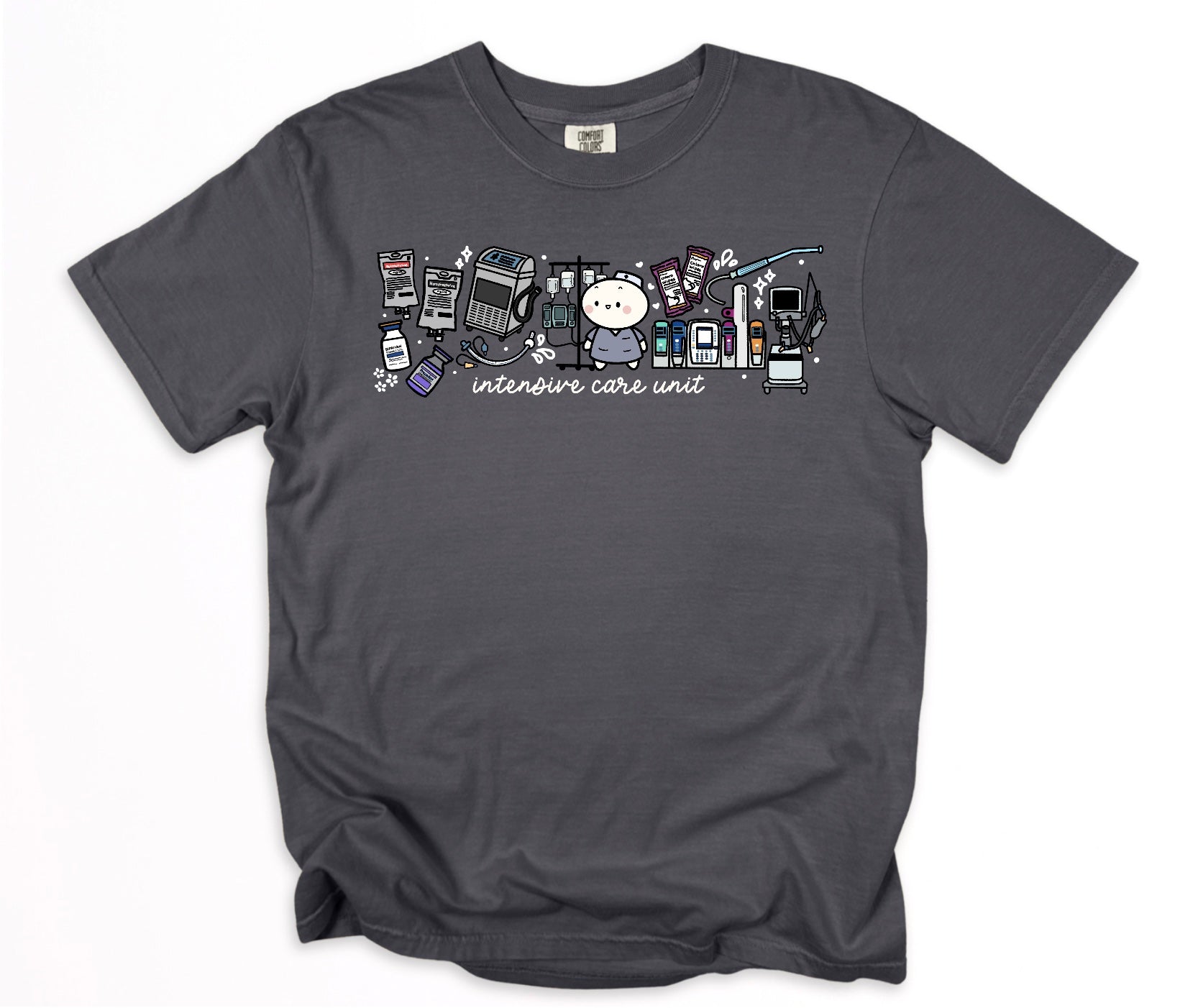 Intensive Care Unit Department (ICU) - Cute, Funny Doodle Nurse Shirt - Crew Neck Short Sleeve Shirt