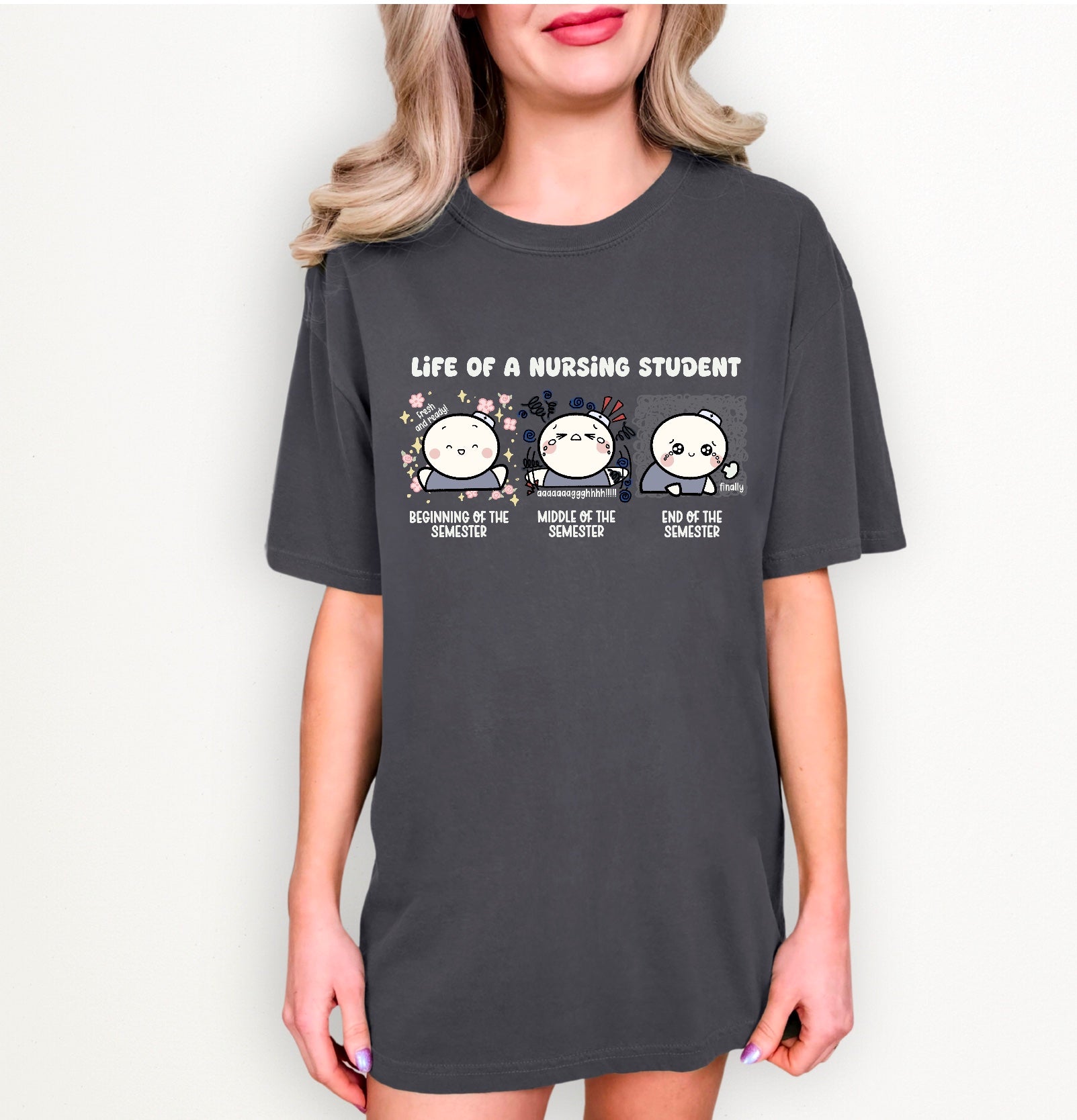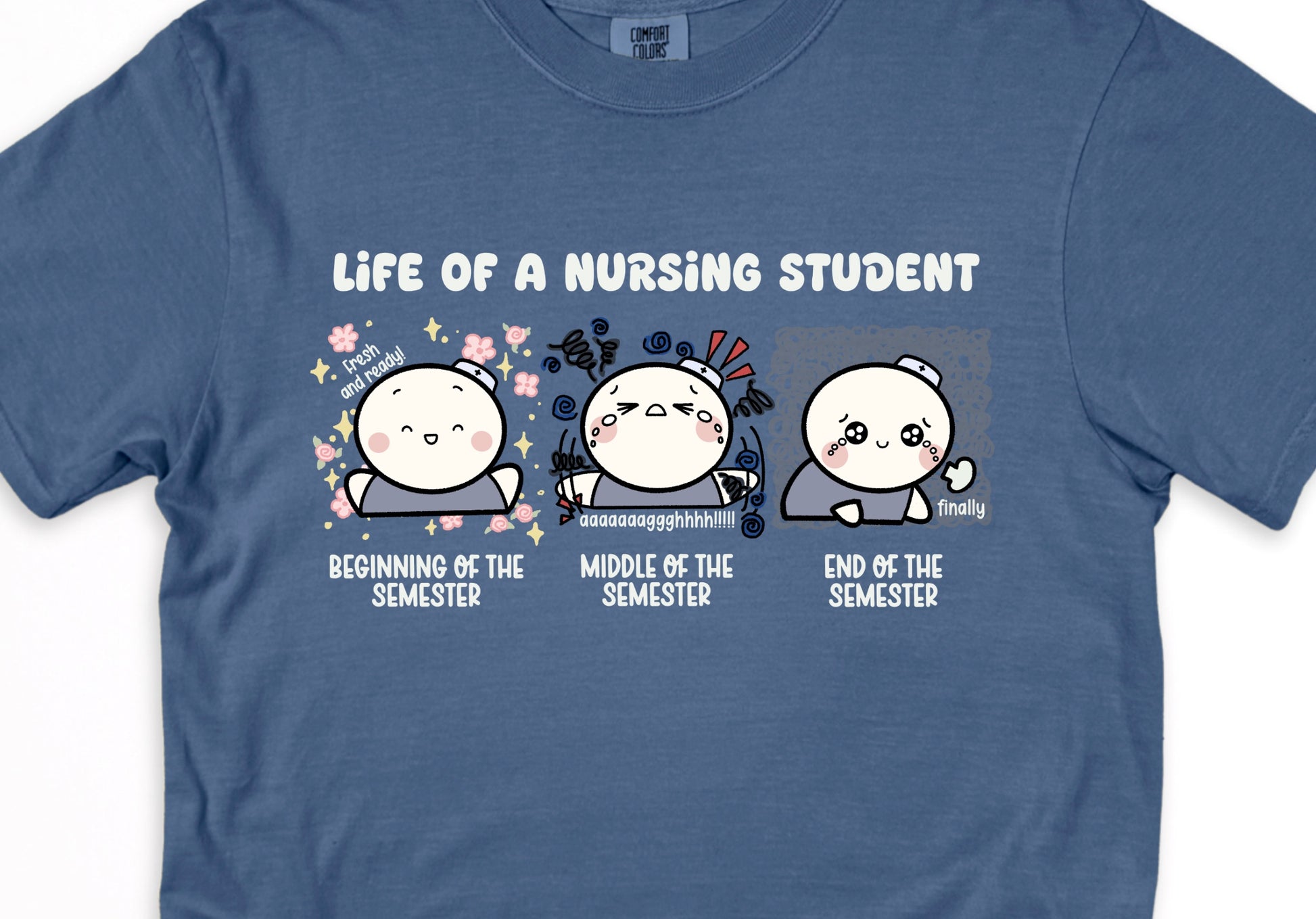 Printed and heat pressed on the ultra-soft and breathable Comfort Colors 1717 shirt, this tee is made from 100% ring-spun cotton with a relaxed fit and garment-dyed fabric that feels just like your favorite worn-in shirt — aka, exactly what you need after back-to-back clinicals and care plans. The doodle artwork brings humor to the highs and lows of each semester, making this a perfect gift for nursing students who need a little reminder that they’re not alone in the struggle.