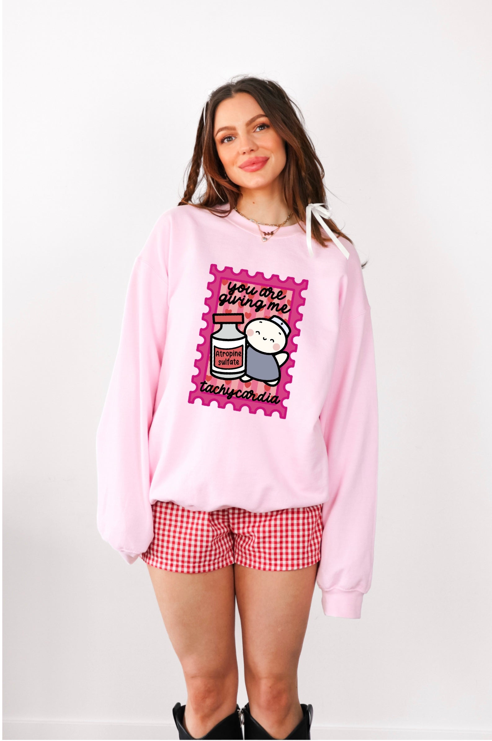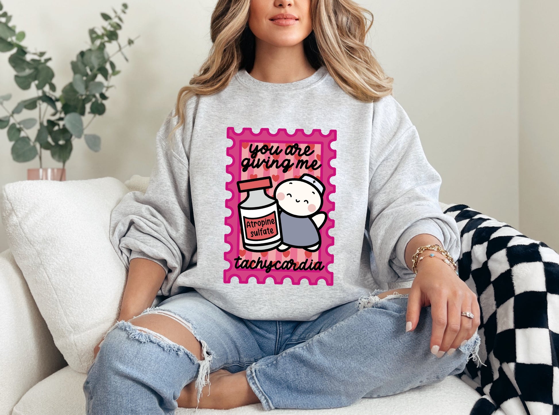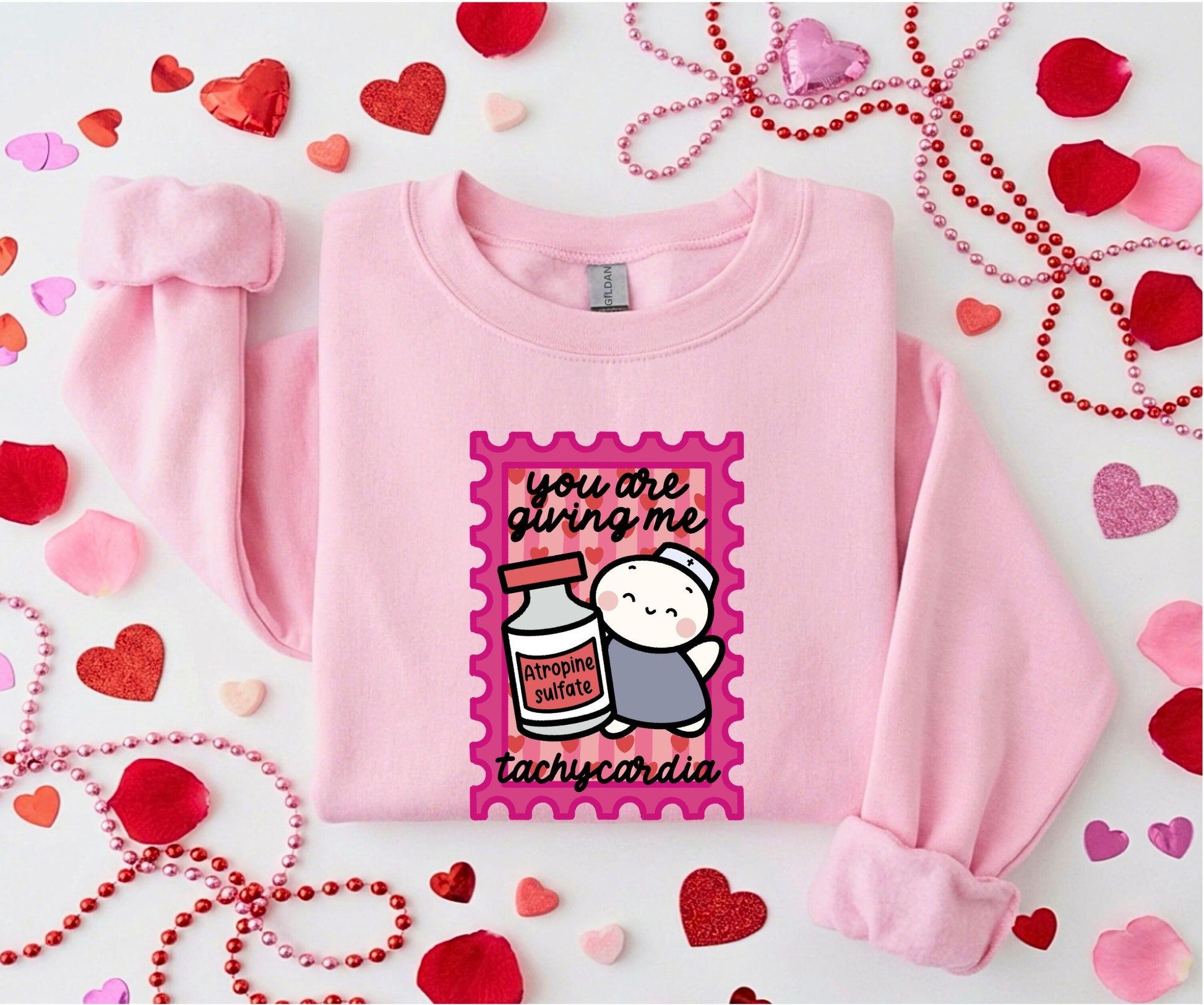 Forget flowers and chocolates — this Valentine’s Day is for nurses who flirt in meds and sarcasm. This sweatshirt is made for those who rock love their clinical way, featuring everyday lifesavers like atropine, because nothing says romance like a sudden spike in heart rate 😉